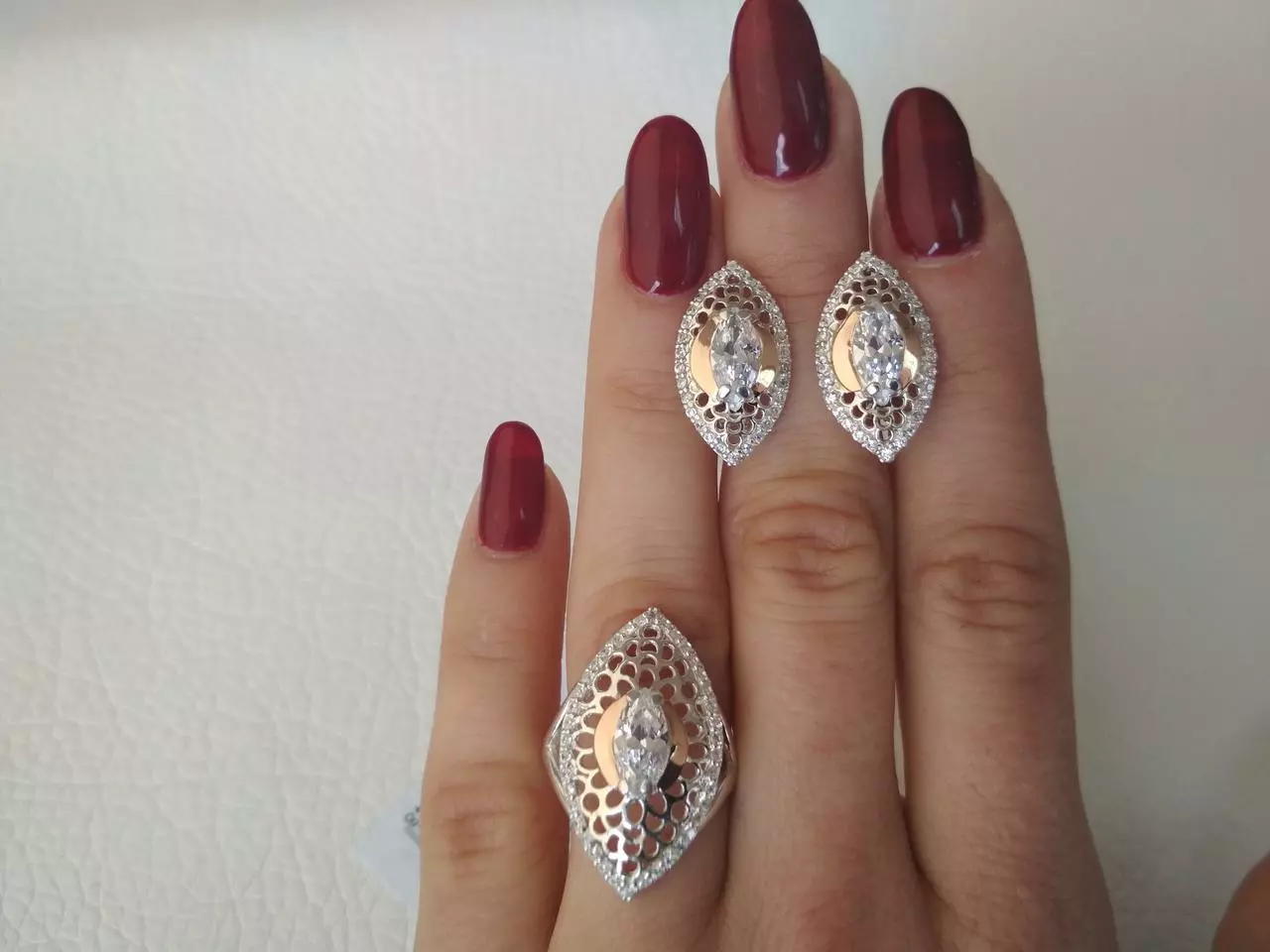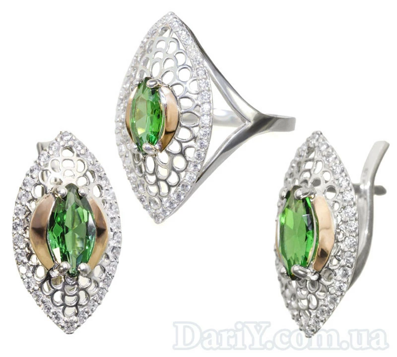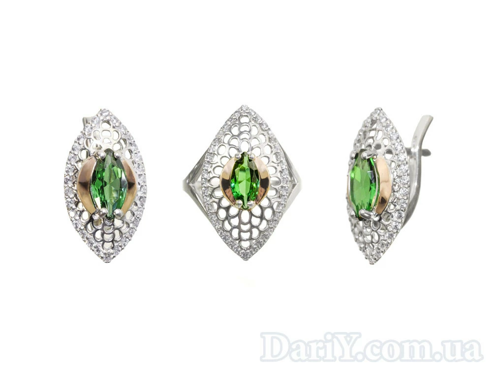 Серебряный набор с золотыми накладками "Адель". Гарнитур с золотыми пластинами и фианитами.