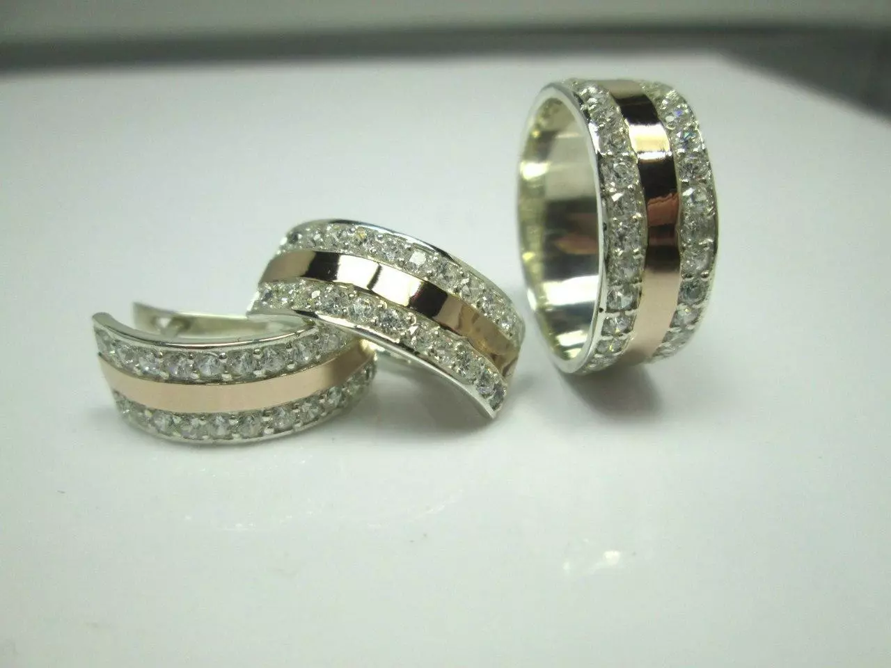 Серебряный набор с золотыми накладками "Мила". Гарнитур с золотинками (напайками, накладками, вставками, пластинами) и фианитами.
