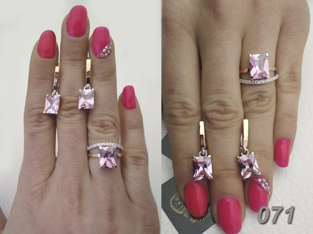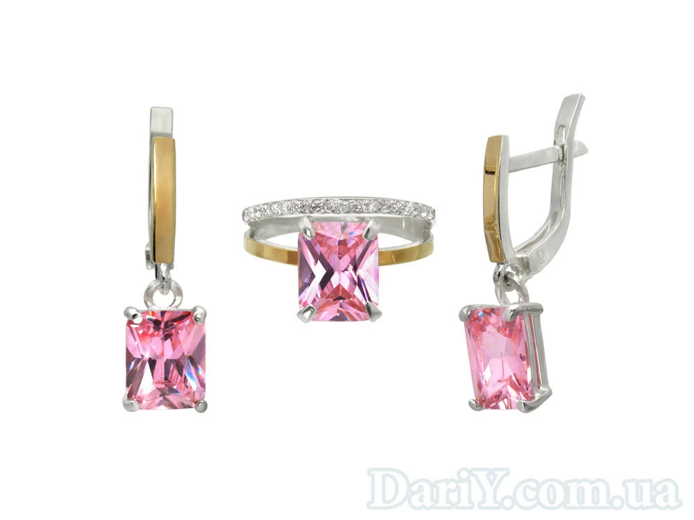Кольцо и серьги с большим розовым прямоугольным камнем и золотыми пластинами.