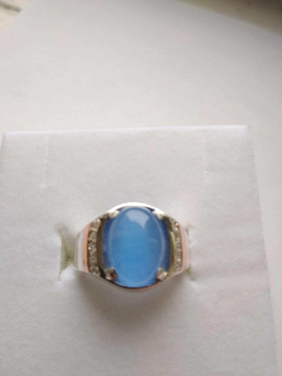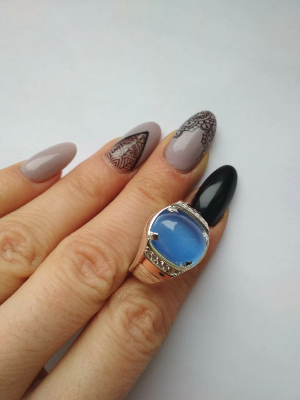 Можно выбрать любой размер кольца, а также тип вставки: Улексит, сапфир, оникс, нефрит, коралл (синий, черный, зеленый, красный).