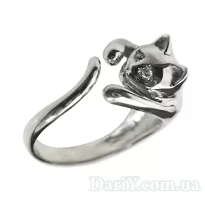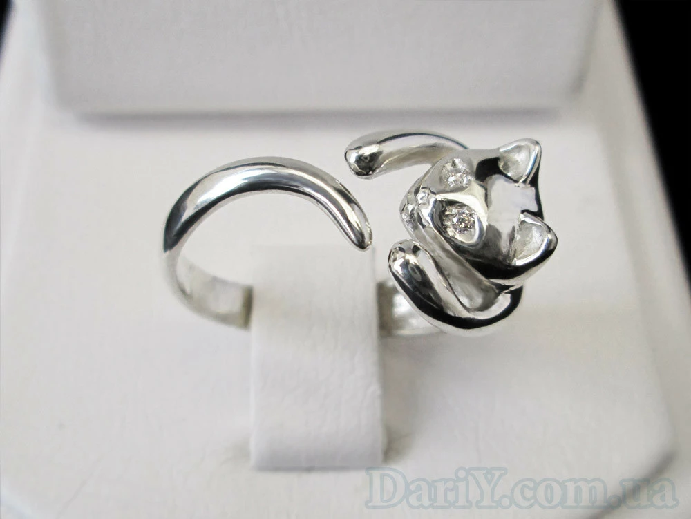 Кольцо в виде кошки из серебра с фианитовыми вставками.