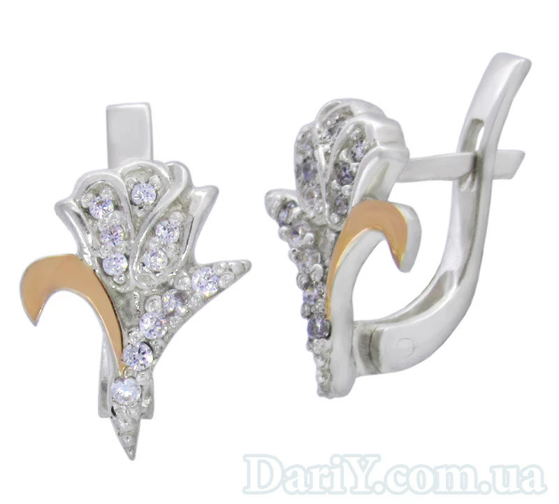 Серьги с цветком из серебра с золотыми пластинами и фианитами