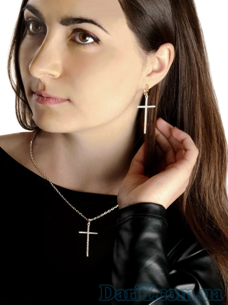 Серьги в форме крестика из серебра с фианитами и золотыми