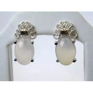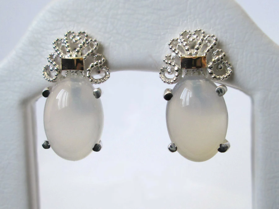 Серьги из серебра с ажурными элементами, золотыми пластинками и овальным кабошоном.