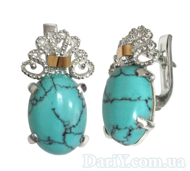 Серьги из серебра с ажурными элементами, золотыми пластинками и овальным кабошоном из бирюзы.