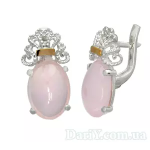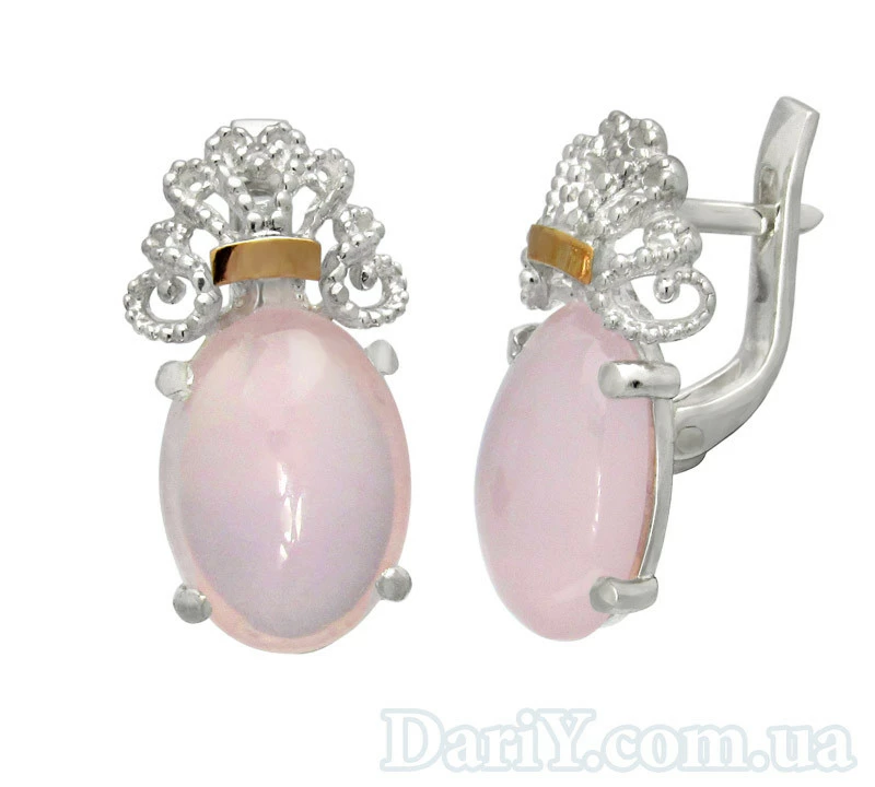 Серьги из серебра с ажурными элементами, золотыми пластинками и овальным кабошоном из розового кварца.